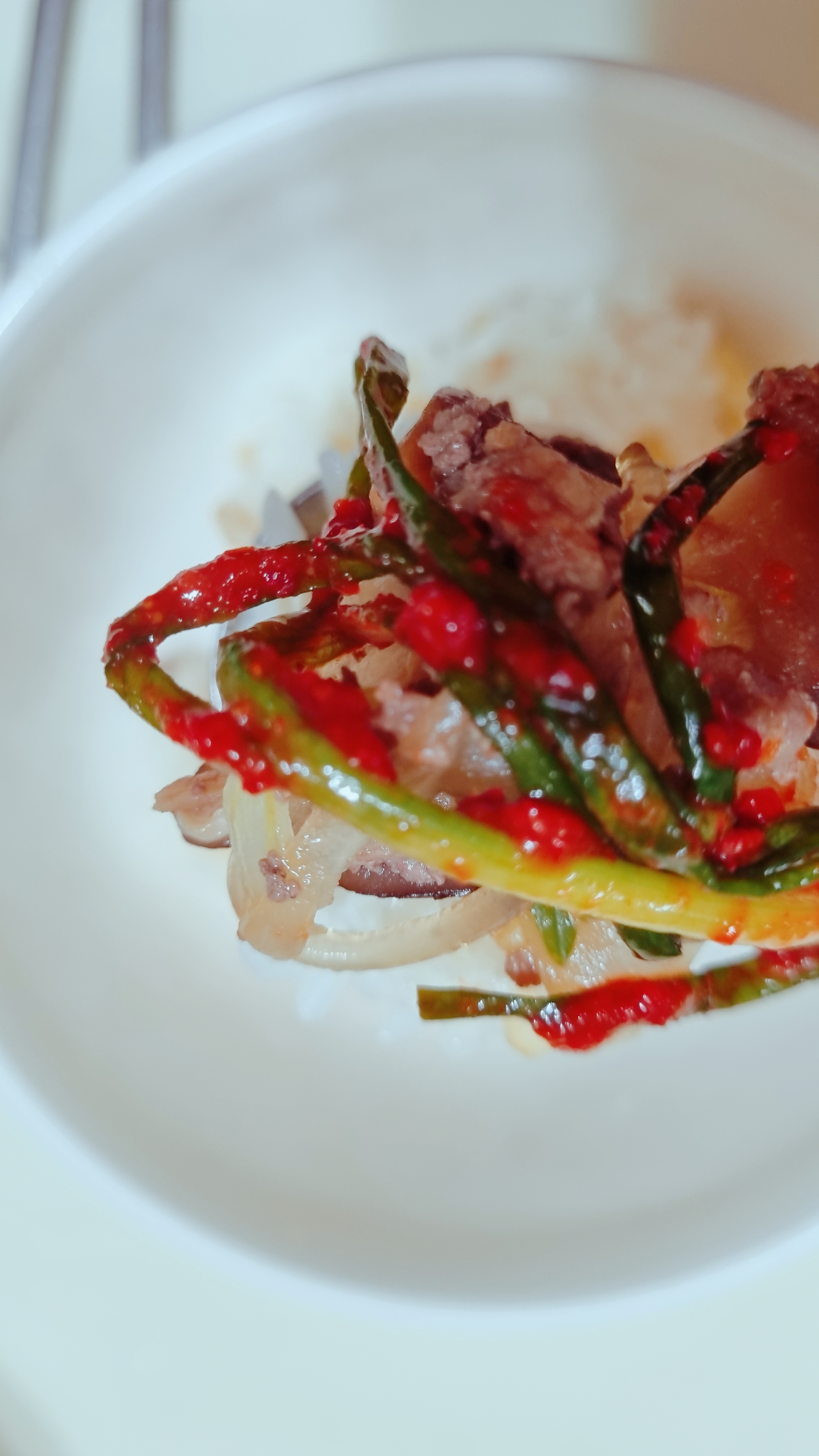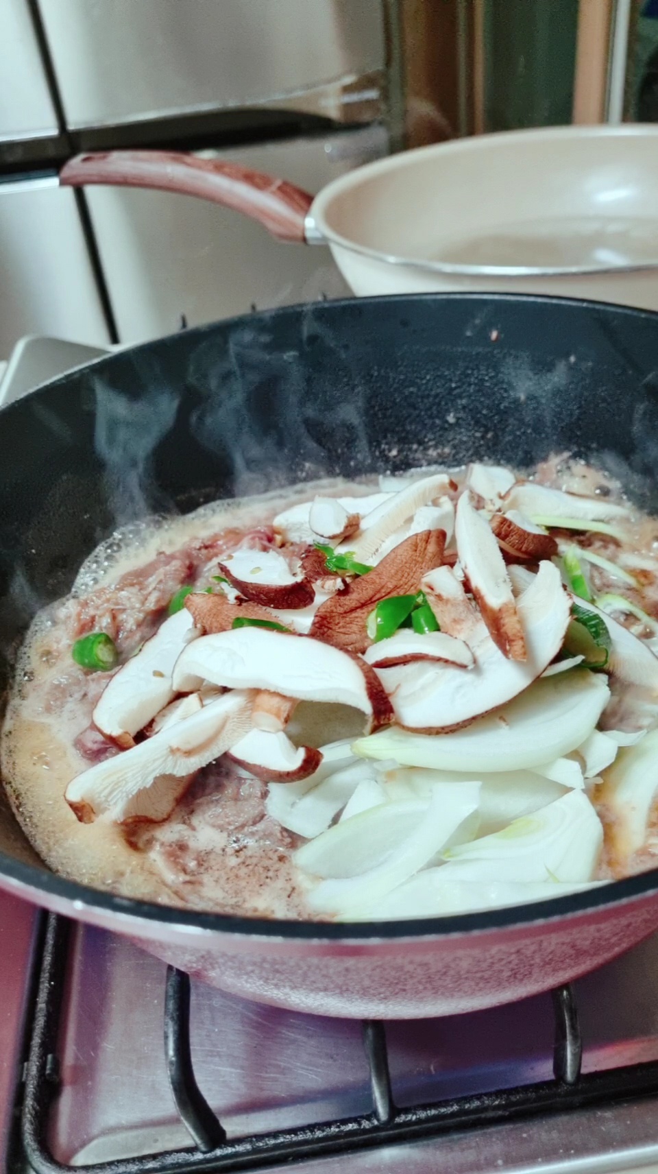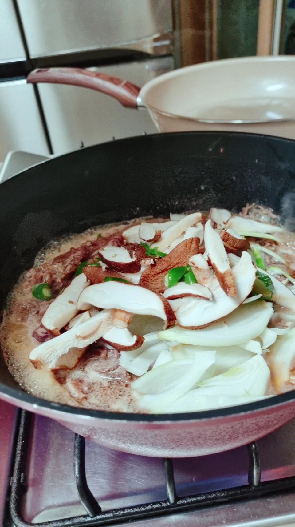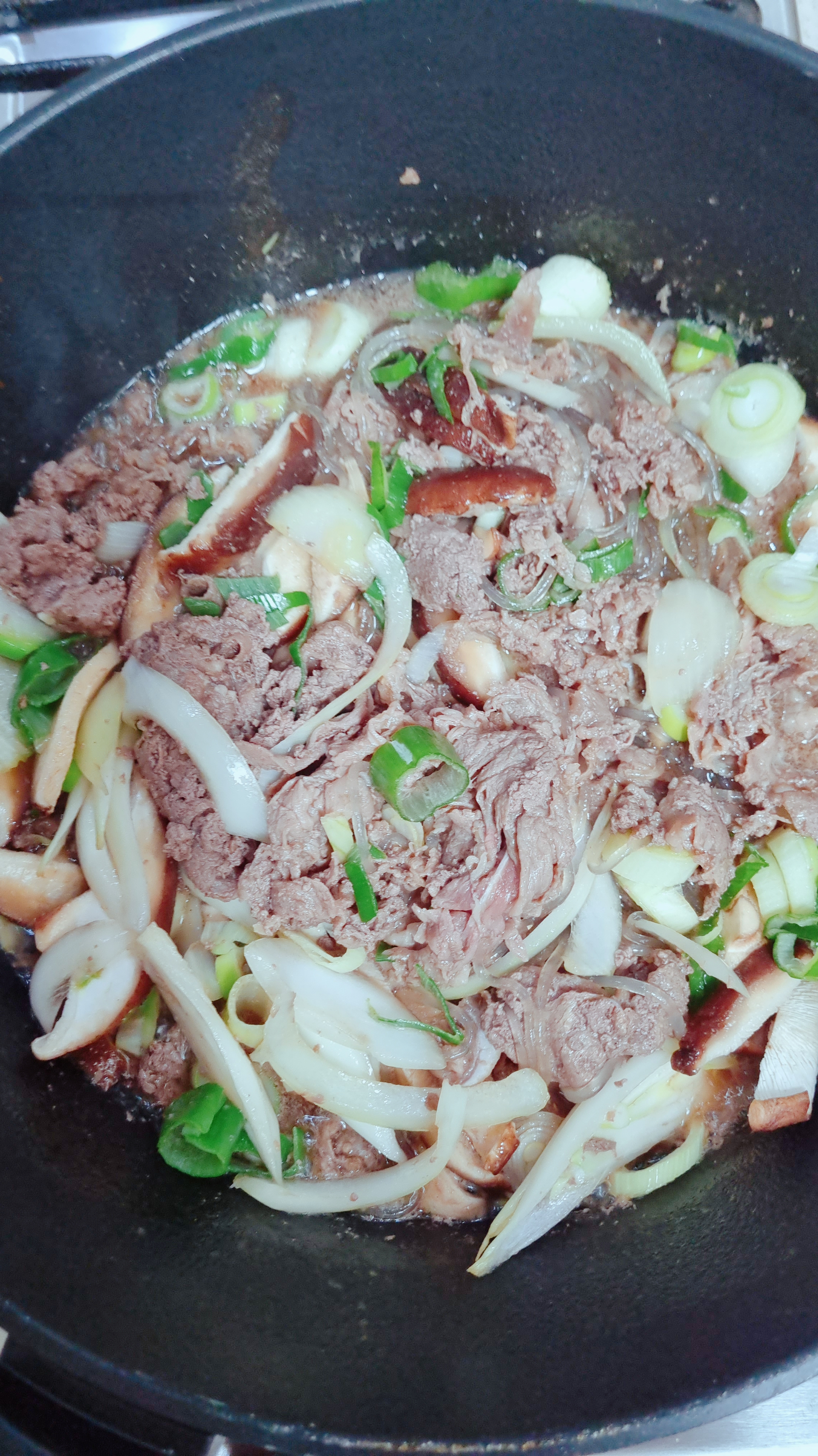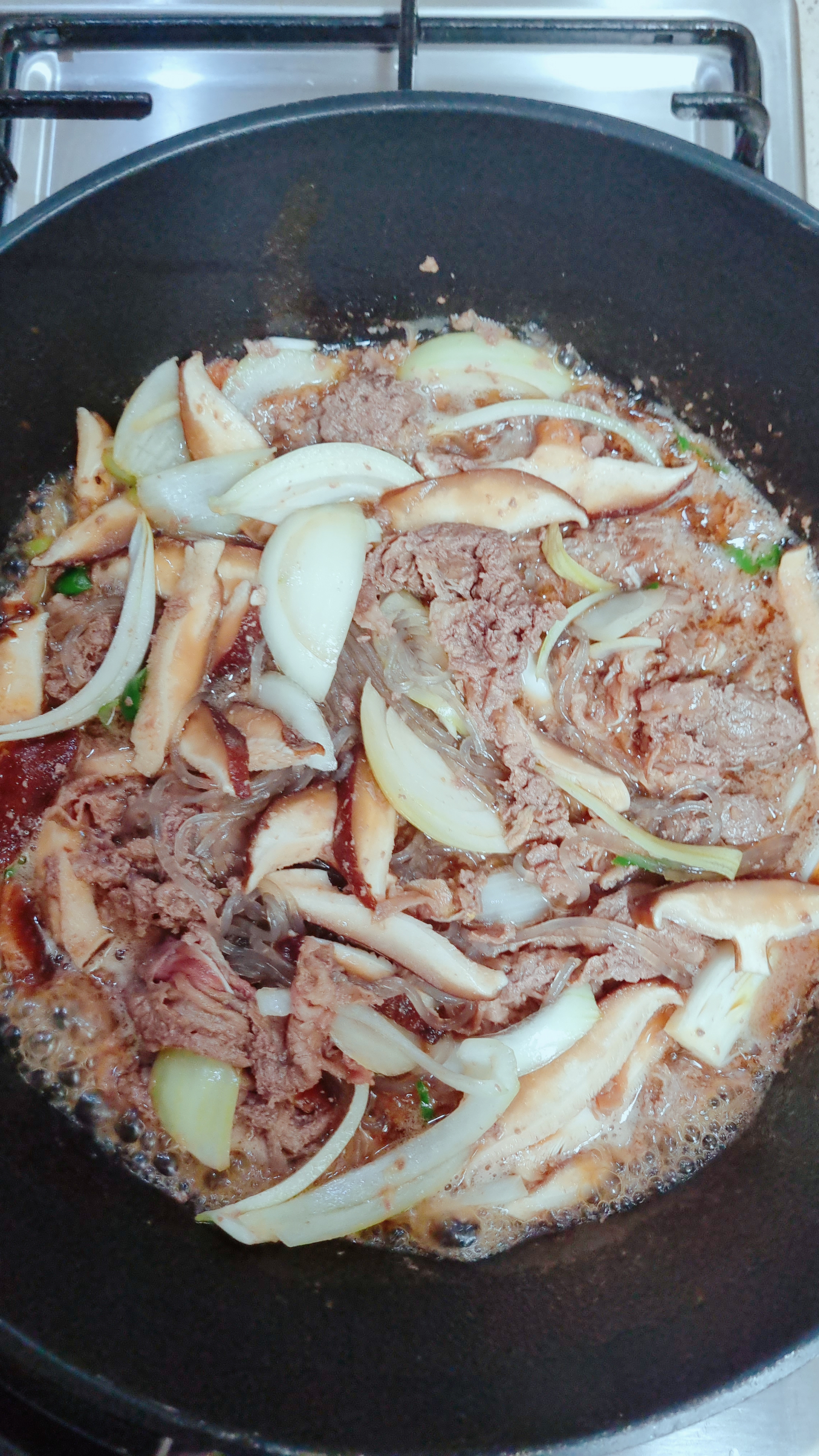 정말 간단한 밀키트라서 고기만 넣고 볶아도 맛있지만 고기는 야채와 같이 먹어 얀다는 지론이 있어서 버섯, 양파, 청양고추, 대파등 냉장고 털이로 추가하고, 소불고기엔 역시 불린 당면 호로록하는 맛이 있어야지요~~
